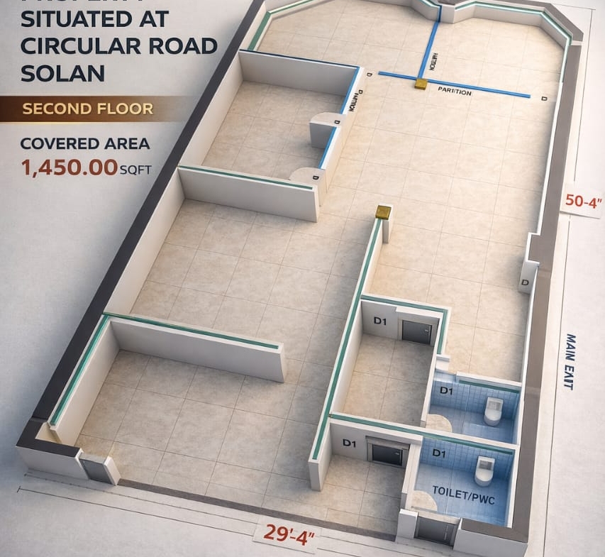 Here is a professionally designed 3D rendered floor plan walkthrough of a 1450 sq. ft. commercial space located on the highly sought-after Circular Road, Solan.